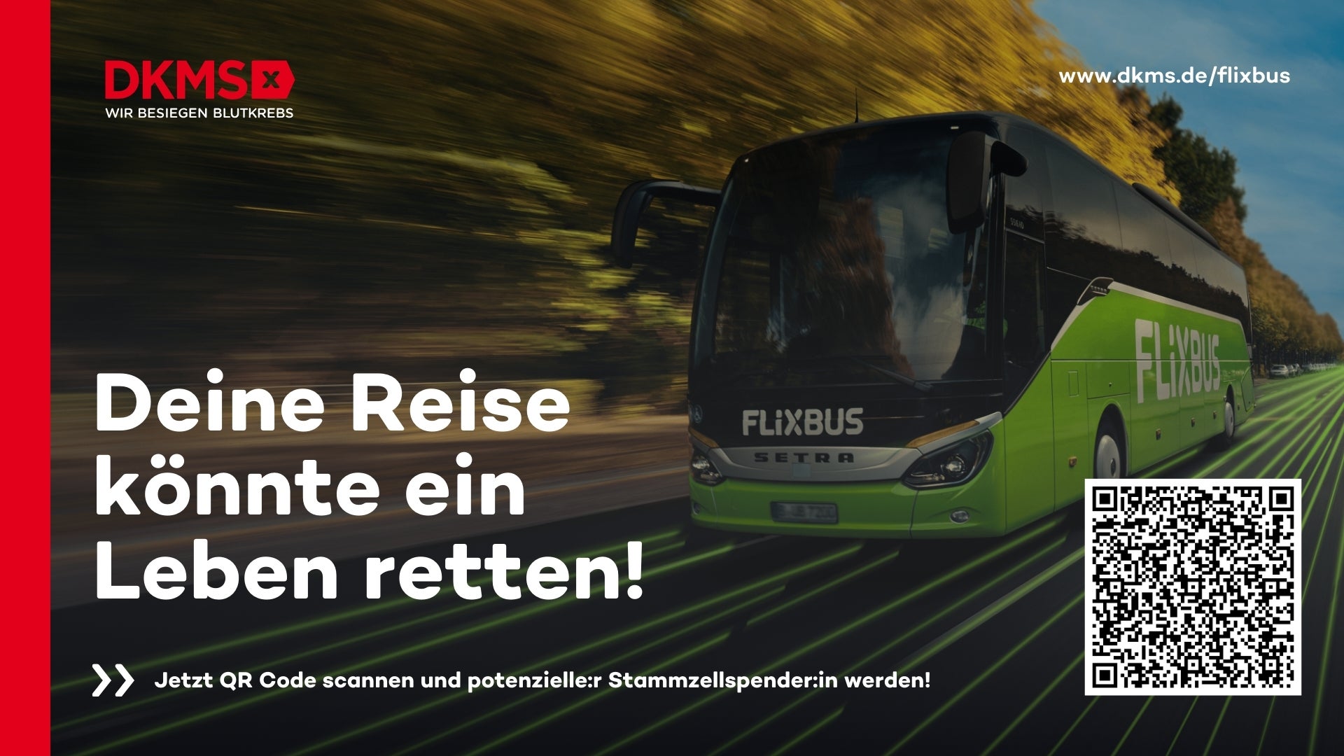 Unter dem Motto „Deine Reise könnte ein Leben retten“ machen Flix und die DKMS den Registrierungsprozess für die Stammzellspende so einfach wie möglich: Reisende, die das WLAN auf FlixBus- und FlixTrain-Fahrten in Deutschland oder im FlixBus in Polen, Chile, Großbritannien und den USA nutzen, werden auf eine spezielle Startseite weitergeleitet und können dort online sofort mit wenigen Klicks ein Registrierungsset der DKMS anfordern. Auch Indien ist Teil der Kampagne, dort sollen neben internen Registrierungsaktionen bei Flix auch weitere Awarenessaktionen geplant werden. In Deutschland umfasst die Initiative neben den Registrierungsmöglichkeiten an Bord auch eine digitale Kampagne, die in den FlixShops prominent ausgespielt wird.