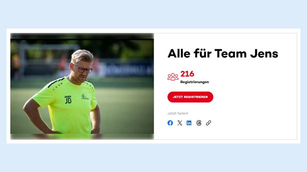 Jens ist Kicker und Trainer mit Leib und Seele. Er weiß, wie man Fußballwissen vermittelt, Spieler:innen motiviert und den Teamspirit stärkt. Zuhause steht seine wundervolle Familie hinter ihm – doch Jens‘ Team ist noch nicht vollständig. Er sucht dringend eine Stammzellespenderin oder einen Stammzellespender, denn Jens hat Blutkrebs.
