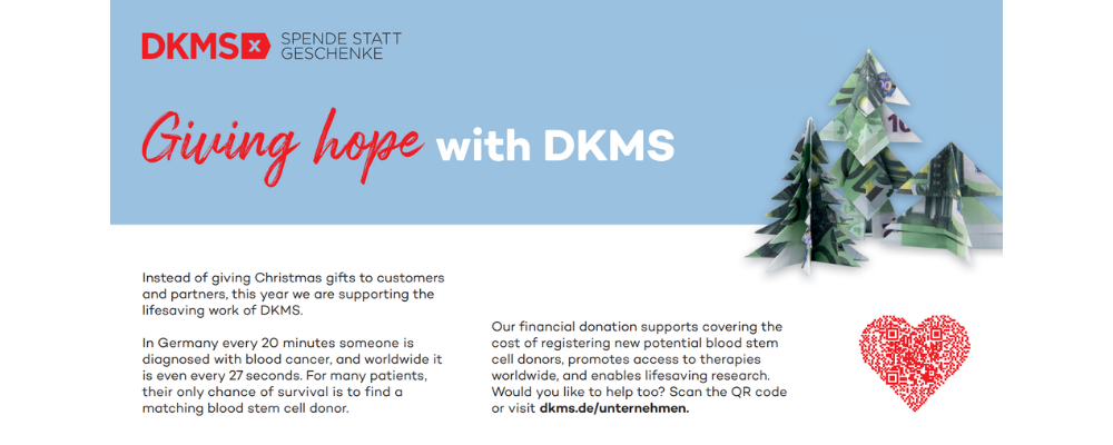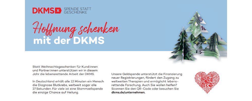 Adventskalender oder Schokoladen-Weihnachtsmänner verschwinden schnell – doch Momente, die Leben retten, bleiben. Anstelle klassischer Weihnachtsgeschenke können Sie Blutkrebspatient:innen eine zweite Lebenschance ermöglichen – und damit viele weitere Feste im Kreis ihrer Liebsten. Zeigen Sie Kund:innen und Partner:innen, was Ihnen wichtig ist: Hoffnung schenken.
