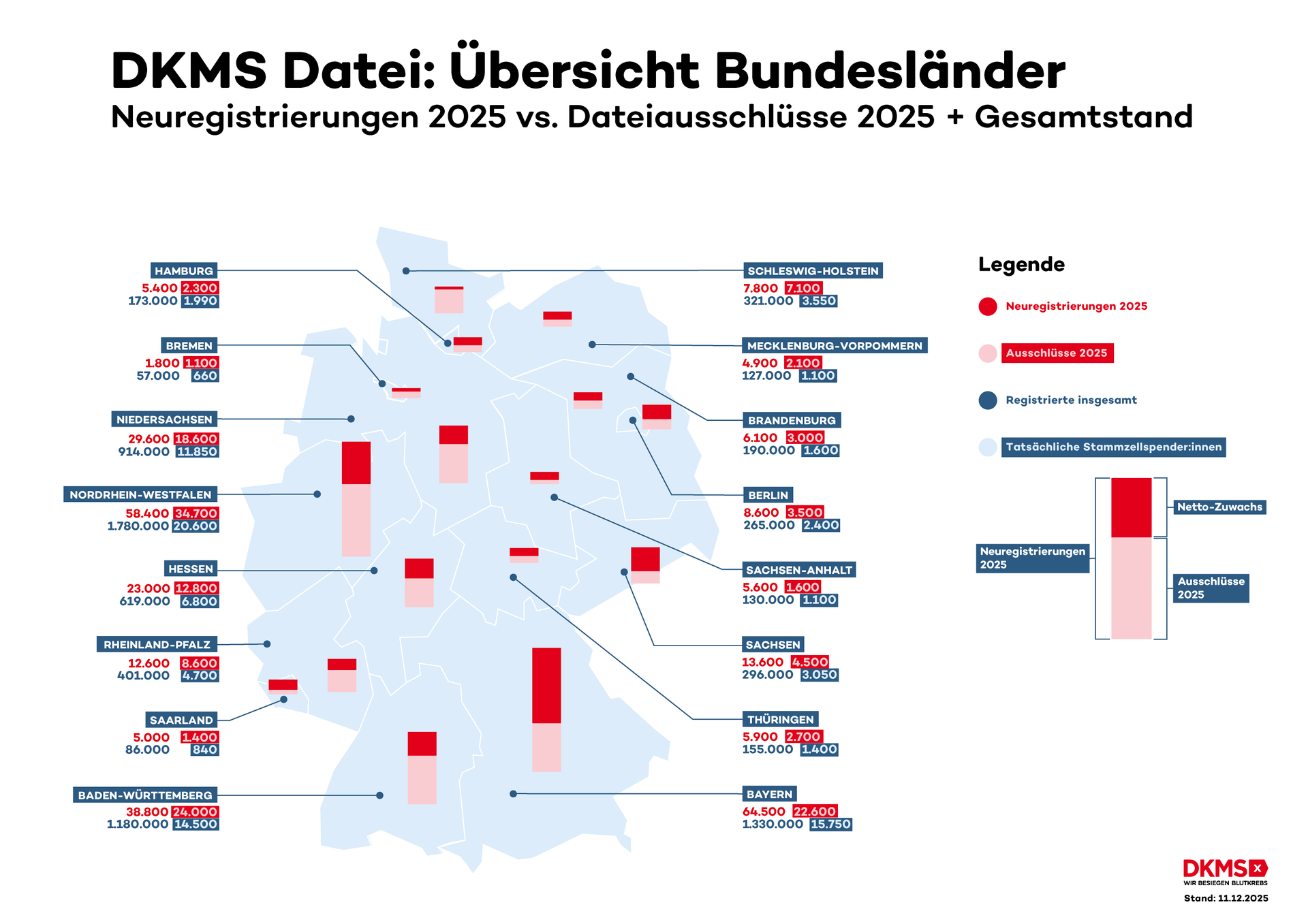 Jeder gesunde Mensch im Alter von 17 bis 55 Jahren kann mit seiner Registrierung den entscheidenden Unterschied machen. Die Chance, tatsächlich zu spenden, liegt bei etwa einem Prozent. Besonders junge Menschen sind wichtig, denn ihre Stammzellen gelten als besonders vital, was bei Betroffenen die Heilungschancen verbessert. Gleichzeitig steigt die Zahl der altersbedingt ausscheidenden Spender:innen weiter an: 2026 werden bereits rund 160.000 Menschen die Datei verlassen – etwa sieben Prozent mehr als noch in diesem Jahr. Tendenz weiter steigend.